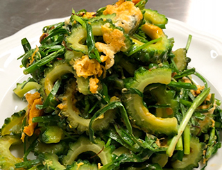 ほうれん草、菜の花、セロリと雑魚の蒸し炒め