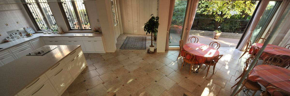 ナチュラルなキッチンとダイニングルームがある1階、ベネチアンモザイクと光がまぶしい2階のキッチンなど、浜内千波のこだわりと思いが詰まったスタジオです。料理教室の生徒さんをお迎えする場として設計しました。 講演会やイベントの開催、撮影スタジオとしても利用しています。
